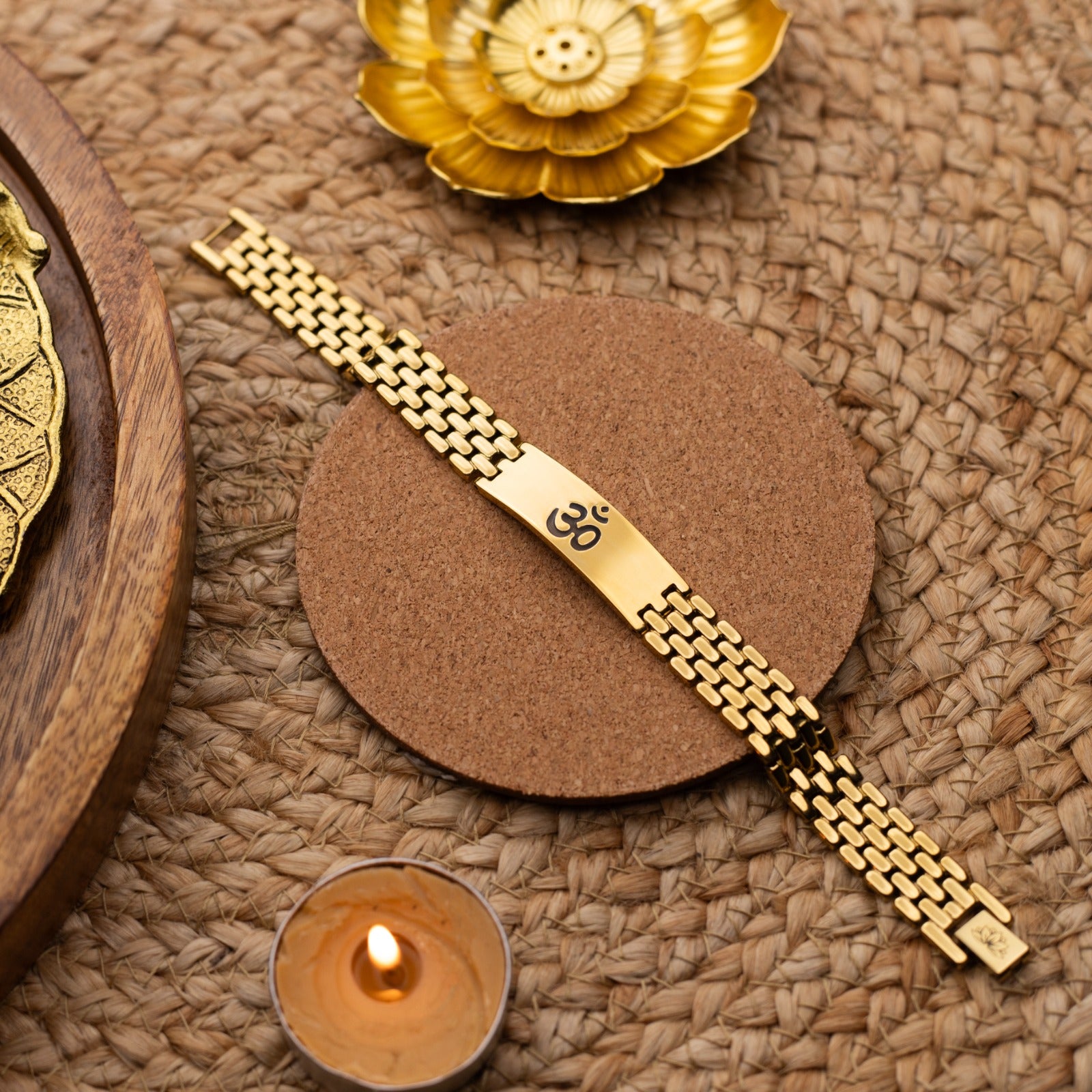 Lord Shiva Inspired Kada with Om Symbol & Rolex Chain Design – Gold-Plated Pure Brass, Adjustable & Temple-Energized with Premium Finish A powerful gold-plated men’s bracelet featuring Om — the symbol of Shiva. Rolex-style belt..